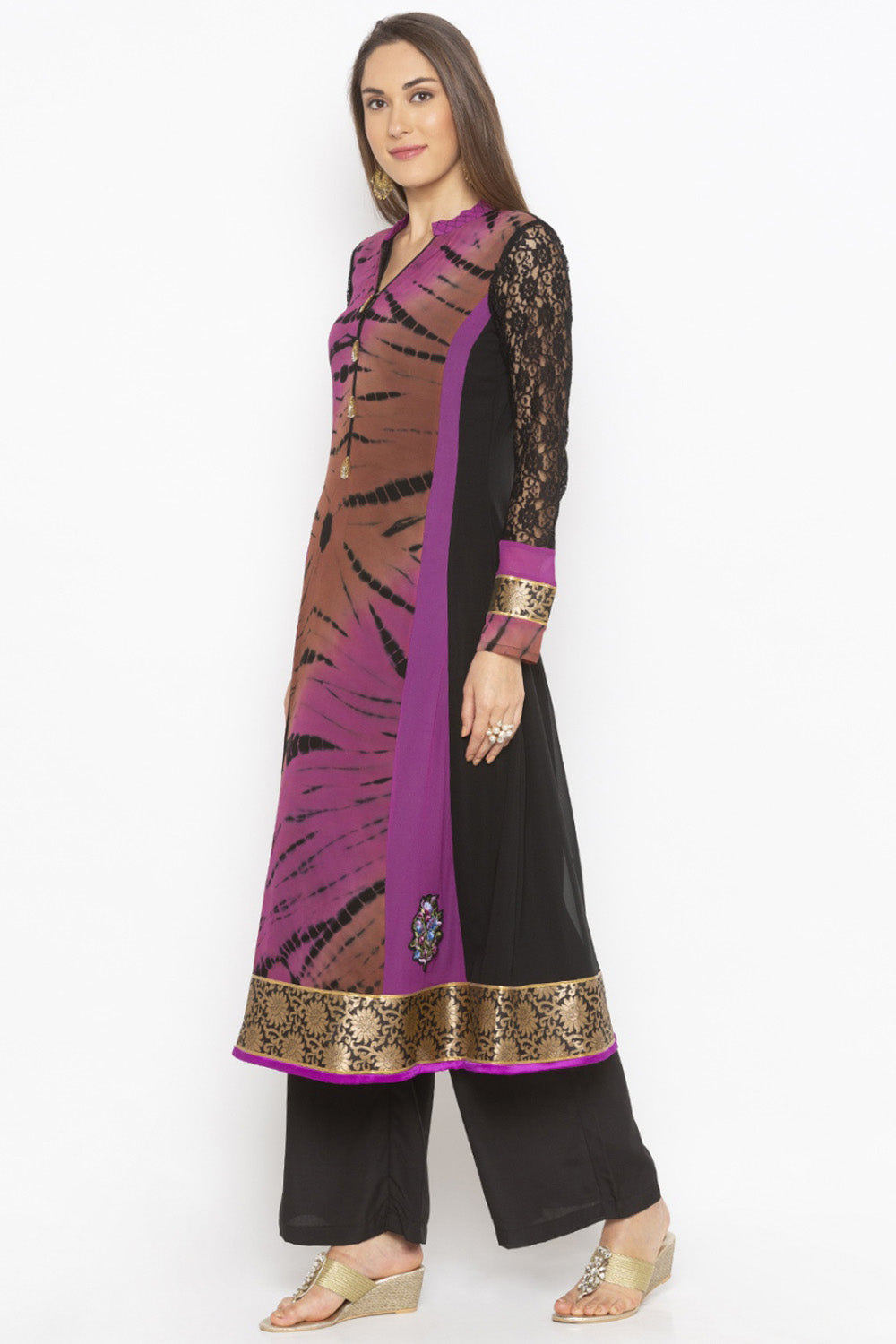 Purple black tie dye batik style shaded kalidar Kurti with black lace piece full sleeves with embroidered buttons and motifs and brocade border with detailing in ghera and Chinese collar