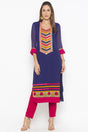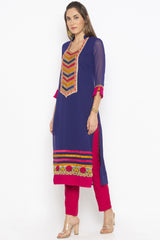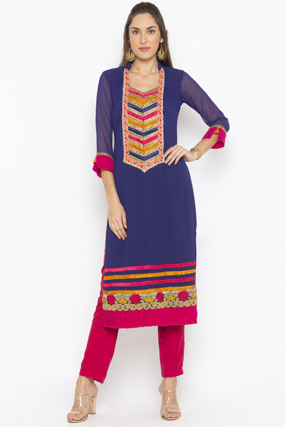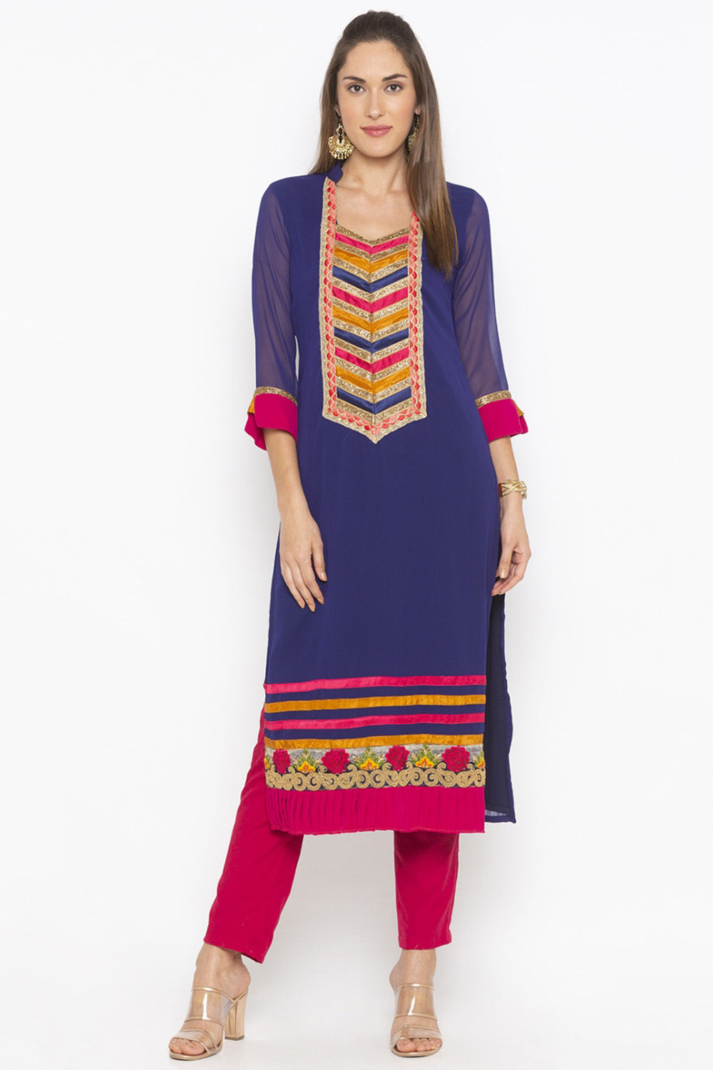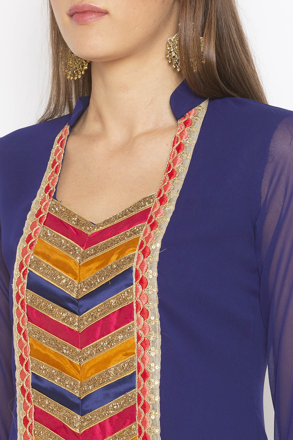Midnight blue georgette Kurti with three quarter sleeves and contrast detailing on it and in the ghera with multicolored embroidered borders on yoke and sleeves.