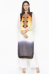 Rust off-white navy blue ombre shaded straight cut Kurti with three quarter sleeves black brocade detailing on shoulders and hemline and heavy embroidery in front.