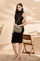 Olive Green And Tan Polyester And Vegan Leather Chevron Quilted Sling Bag