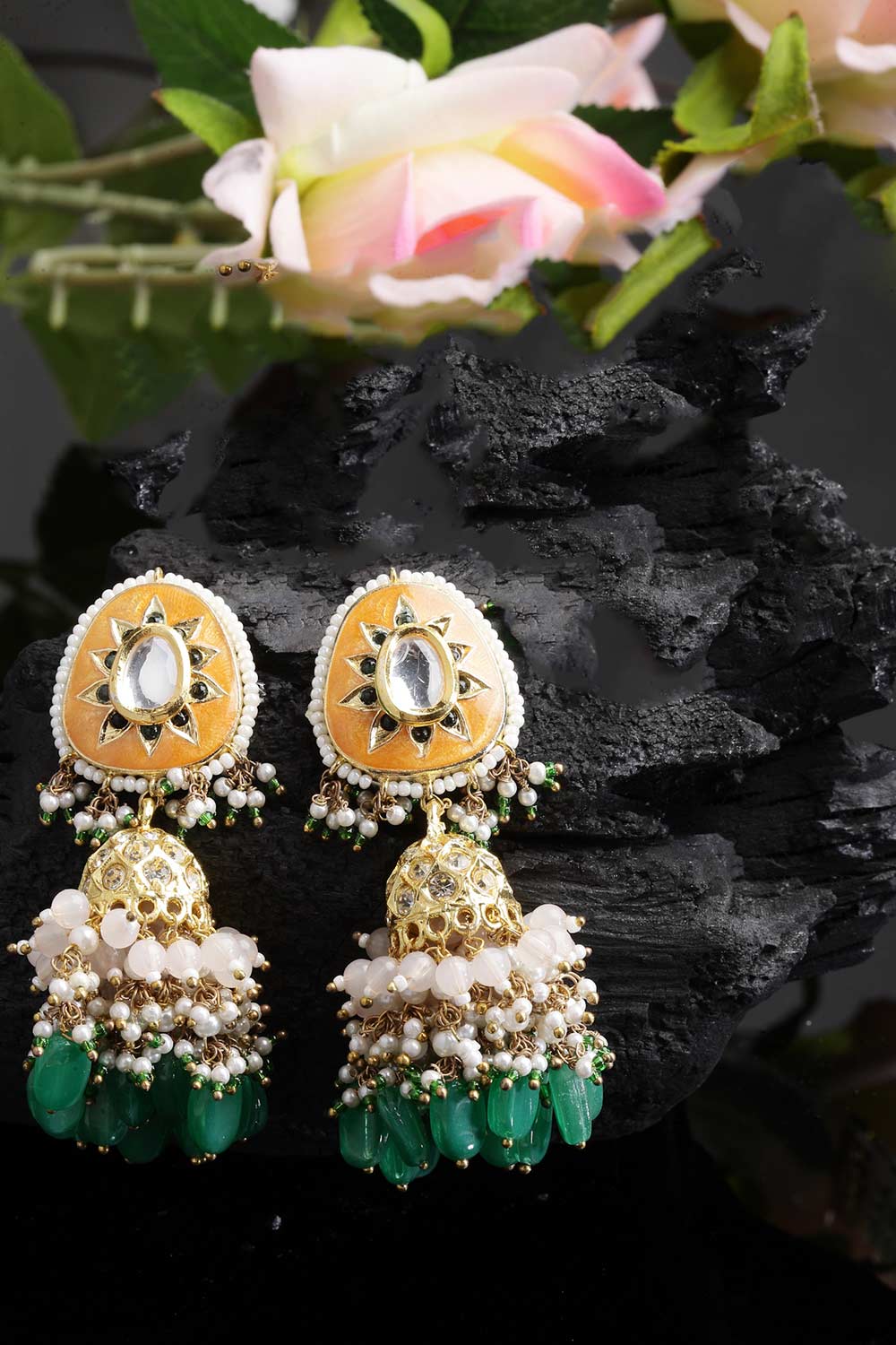 Orange & Green Jhumkas Earring With Kundan & American Diamonds