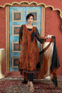Rust Black Leopard Print Chiffon Georgette Anarkali Suit Set Draped Kurti With Black American Crepe Kurti Inside, Hand Embroidery Around Neckline, 3/4 Black Georgette Bell Sleeves With Print Detailing, Rust Detailing On Sleeves And Hemline Edge. Worn With Black Cigarette Pants And Black Rust Shaded Chiffon Dupatta.
