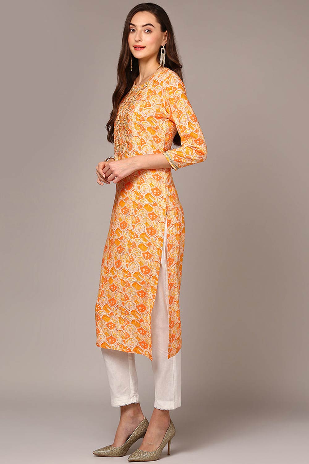 This Orange Rayon Keyhole Neck Kurti is a timeless choice for any occasion. The intricate prints add a touch of sophistication to the ensemble, while the comfortable rayon fabric ensures effortless elegance and ease throughout the day.