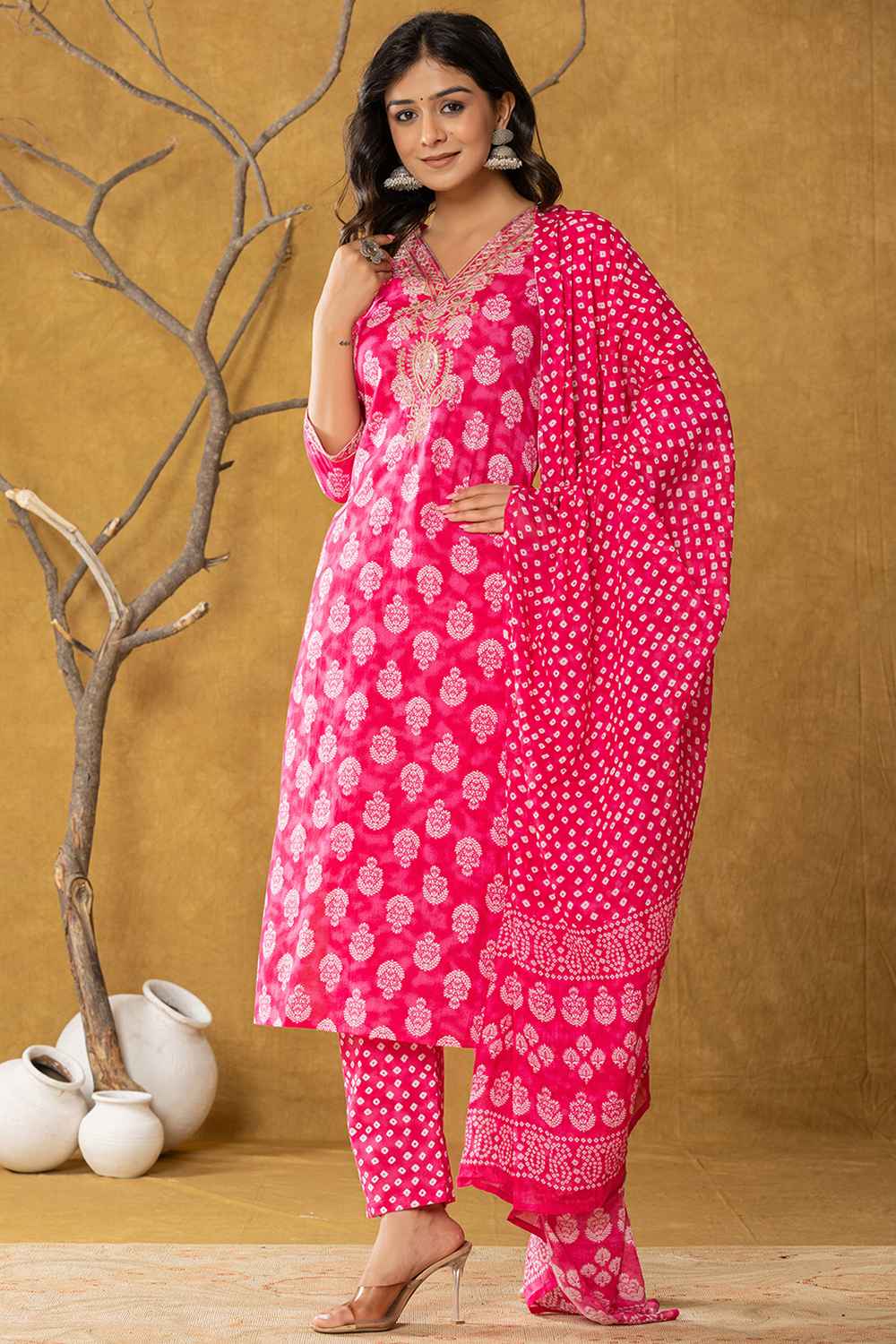 Pink Bandhani Zari Work Pure Cotton Kurti Pant Set