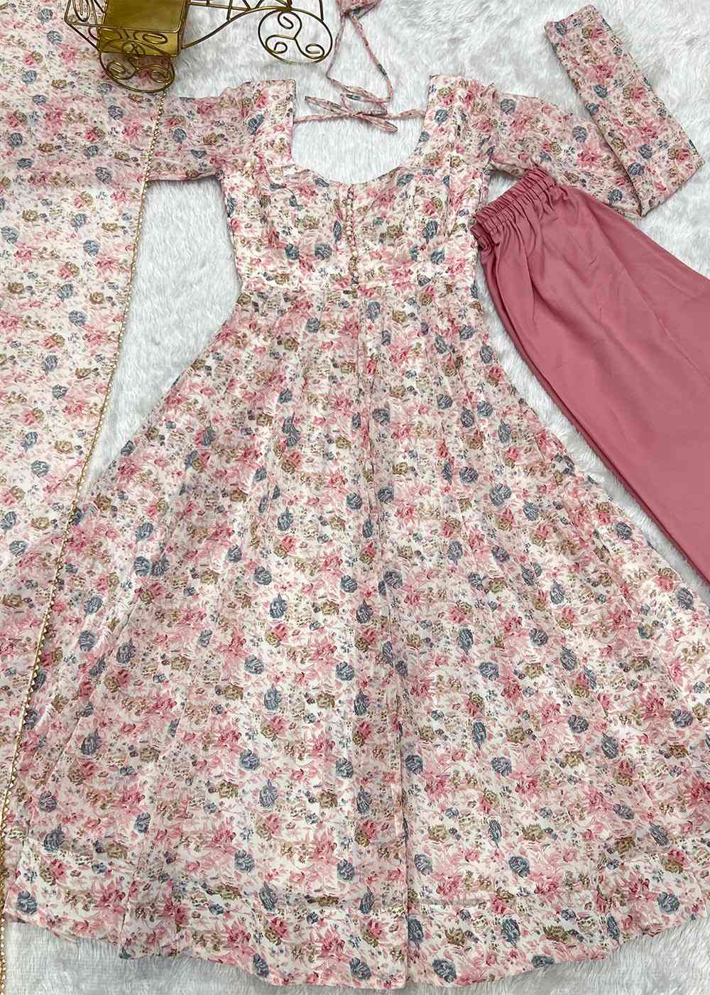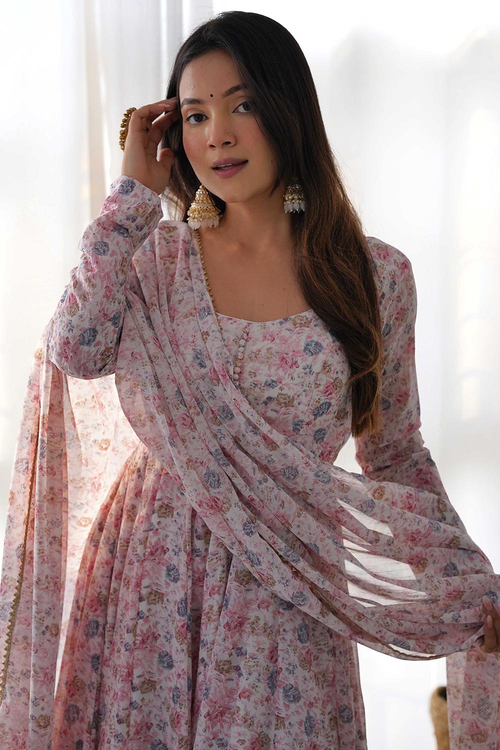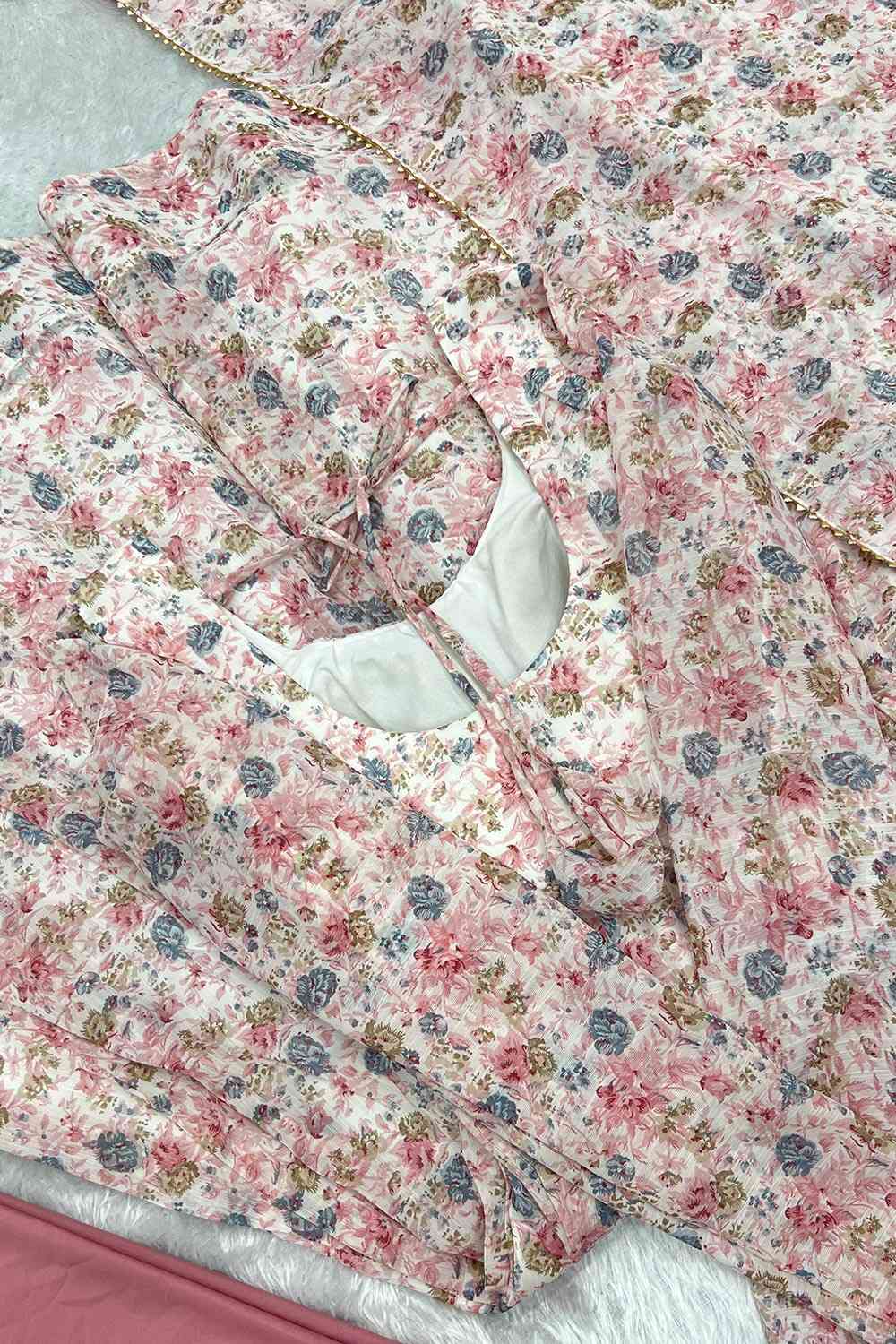 Pink Chiffon Floral Print Anarkali Kurti With Dupatta And Pant