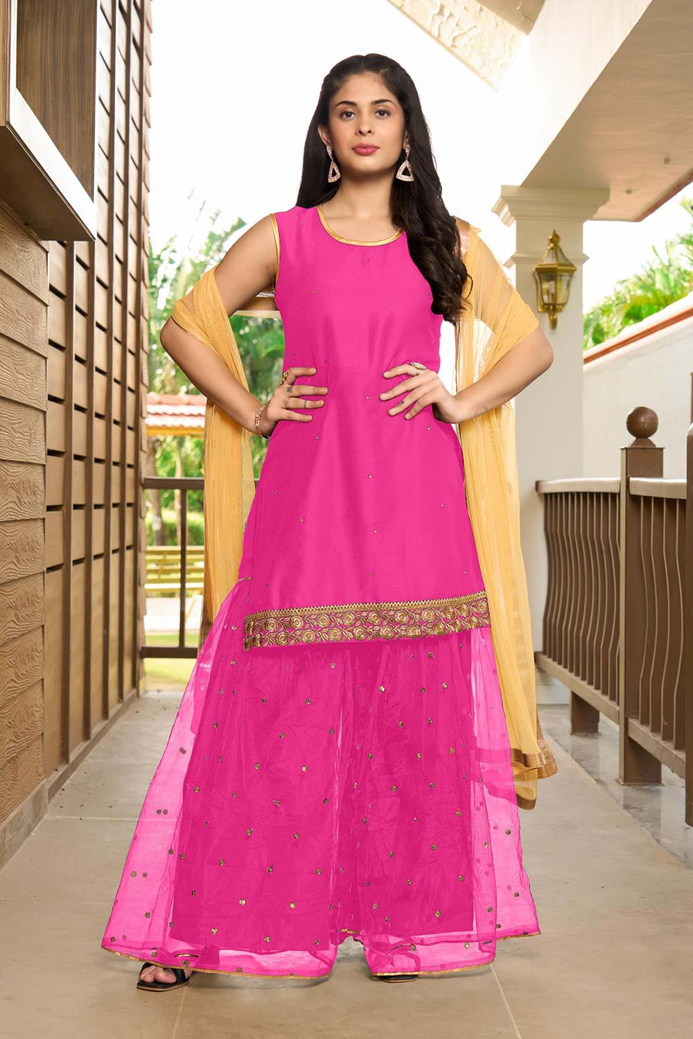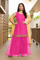 The cotton embroidered Sharara suit set boasts intricate embroidery and premium fabric that ensures both comfort and luxury. Its unique design and perfect fit make it an ideal choice for weddings or cultural celebrations.
