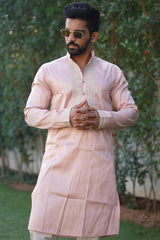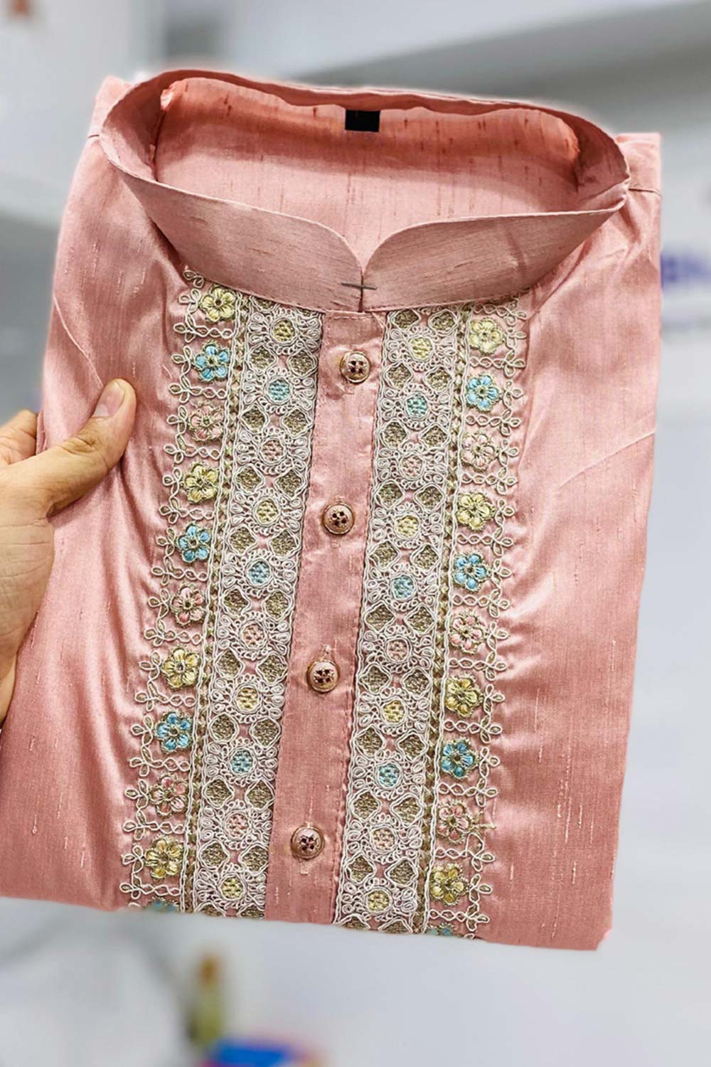 Dress him in elegance with our Kurta Pajama Set, a classic Kurta Set designed for timeless style. Crafted from soft Silk it offers a comfortable fit for all-day wear. The intricate Embroidered on the Kurta adds a traditional touch to this outfit. Perfect for festivewear this Kurta Set is a versatile choice for any festive or formal occasion. Pair it with white churidar pants and traditional juttis for a complete ethnic outfit. Make every moment special with the charm of Kurta and Pajama Set