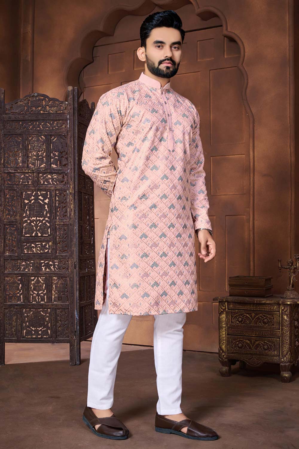 Dress him in elegance with our Kurta Pajama Set, a classic Kurta Set designed for timeless style. Crafted from soft Silk it offers a comfortable fit for all-day wear. The intricate Embroidered on the Kurta adds a traditional touch to this outfit. Perfect for festivewear this Kurta Set is a versatile choice for any festive or formal occasion. Pair it with white churidar pants and traditional juttis for a complete ethnic outfit. Make every moment special with the charm of Kurta and Pajama Set