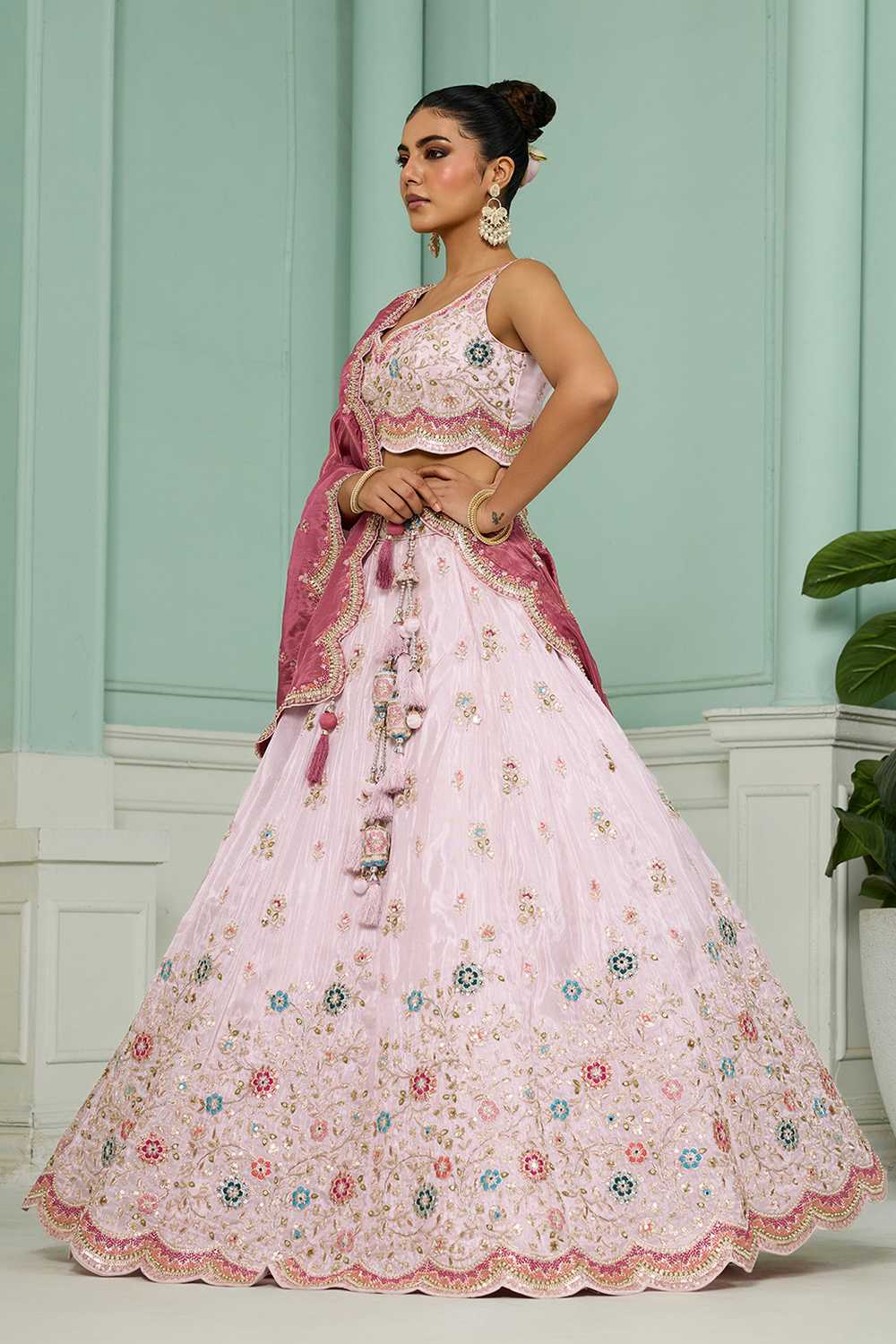 Pink Floral Embroidered Tissue Lehenga