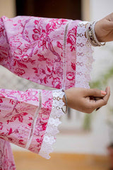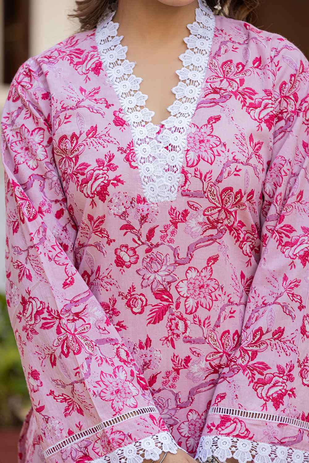 Pink Floral Print Lace Work Pure Cotton Kurti Pant Set