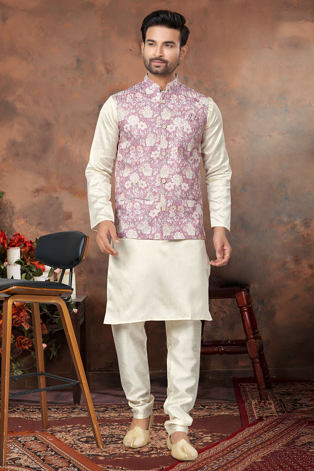 Experience timeless style with our Kurta Pajama Koti Set a perfect balance of tradition and modern sophistication. Made from Mastani Silk this kurta set offers unmatched comfort and a refined look. Featuring Floral Printed it reflects a rich heritage with a modern touch. Designed for Wedding,Engagement this outfit is perfect for special occasion or your celebrations. Complete the look with mojari shoes and a classic watch for a dapper appearance. Make every occasion special with the elegance of Kurta Pajama Koti Set