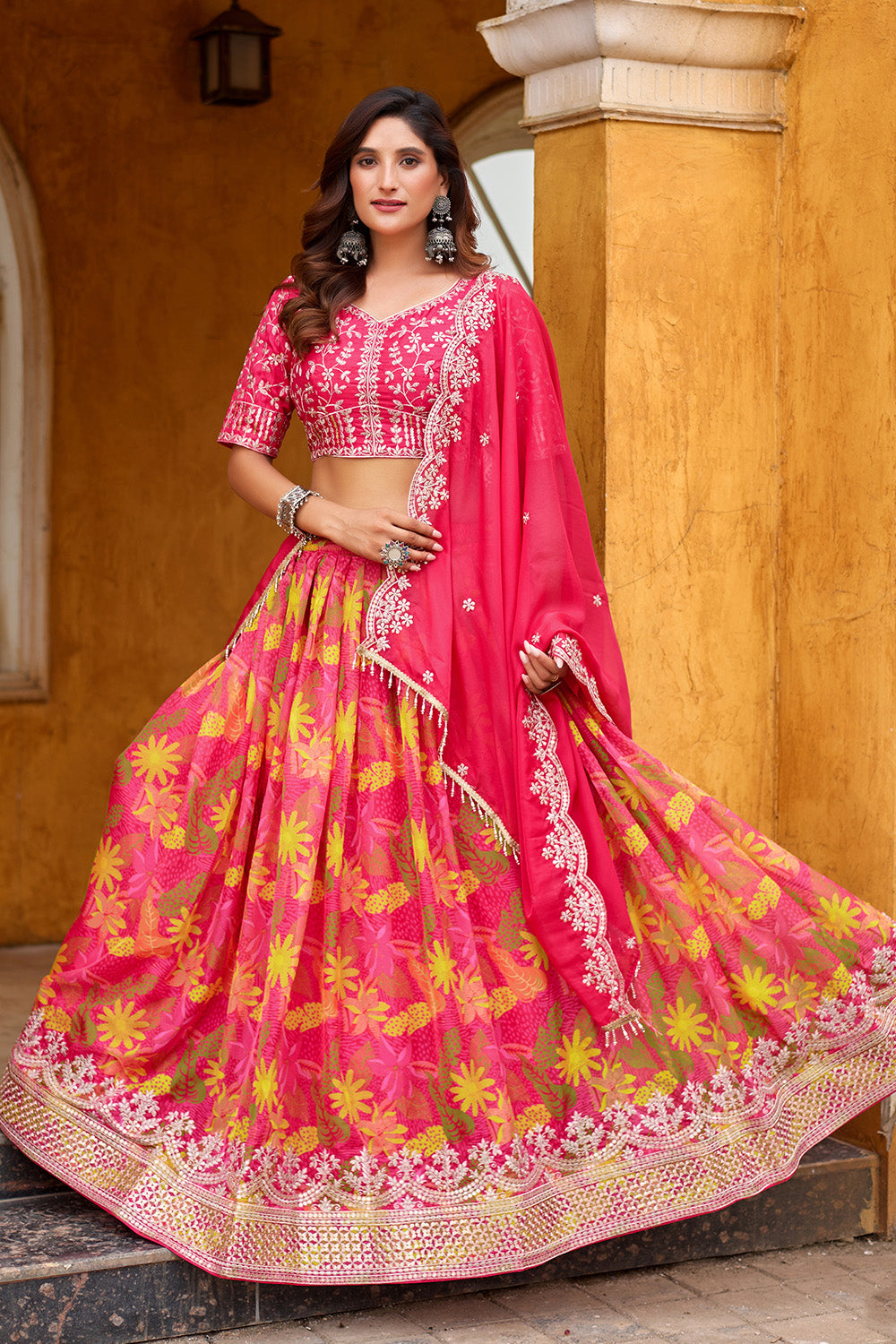 Step into the spotlight with our Lehenga a dazzling creation designed to make your special moments unforgettable. Crafted from premium Silk this lehenga offers a perfect combination of elegance and ease, keeping you graceful all day long. The exquisite Floral Printed makes this lehenga a masterpiece of traditional craftsmanship. Whether it’s Festive or a grand celebration, this lehenga is the perfect choice to make a statement. Pair it with an ornate choker, a matching dupatta, and embellished stilettos to complete the regal look. Add a sleek bun or cascading curls for added glamour. Make every moment magical with the timeless allure of Lehenga
