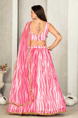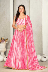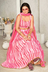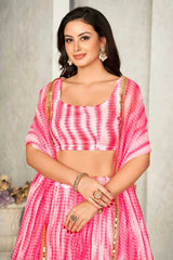 Sophisticated and stylish, this Pink Georgette Printed Round Neck Lehenga features beautiful round neck embroidery and a flowing skirt for an elegant look.