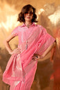 The saree is made from linen, a natural fiber known for its breathability, durability, and slightly textured finish. The base color is pink.