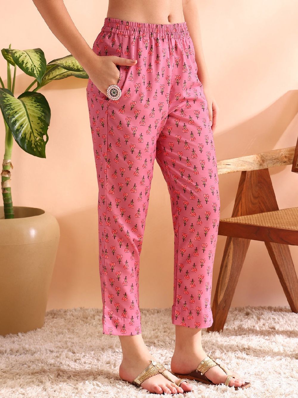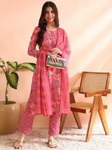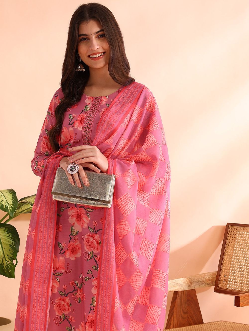 Pink Poly Rayon Floral Printed Straight Kurti Pants With Dupatta