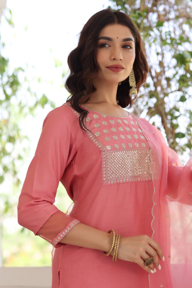 Pink Poly Silk Solid Sequin Straight Suit Set