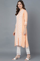 This Pink Polysilk Embroidered Mandarin Collar Kurti is a timeless choice for any occasion. The intricate prints add a touch of sophistication to the ensemble, while the comfortable rayon fabric ensures effortless elegance and ease throughout the day.