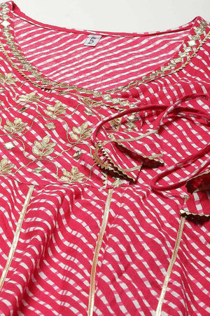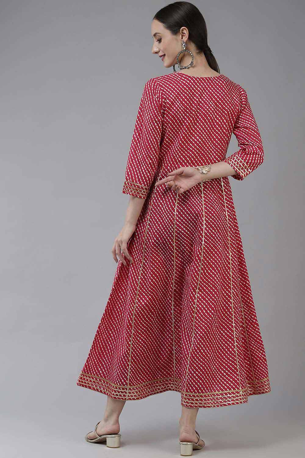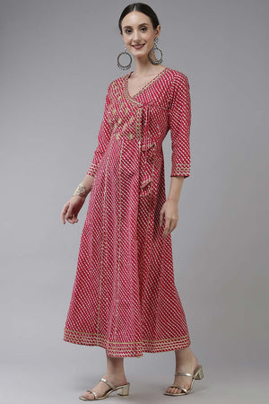 Pink Screen Leheriya Print Embroidery woven Maxi dress, has a V-Neck, three-quarter regular Sleeves Anarkali shape with angrakha style Gotta patti detail Full on closure, and flared hem Comes Size & Fit Regular fit Material & Care Pura Cotton, Hand-wash