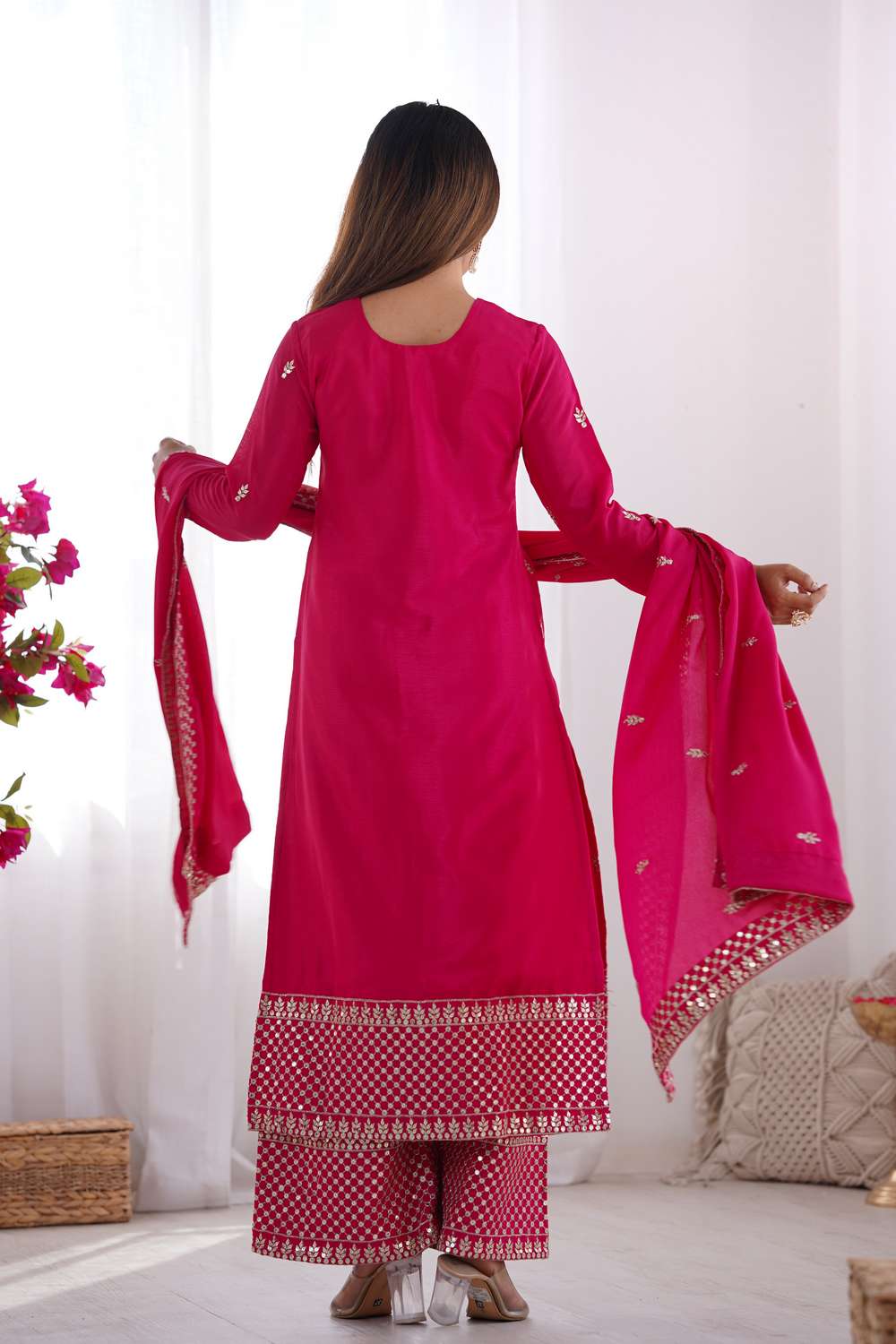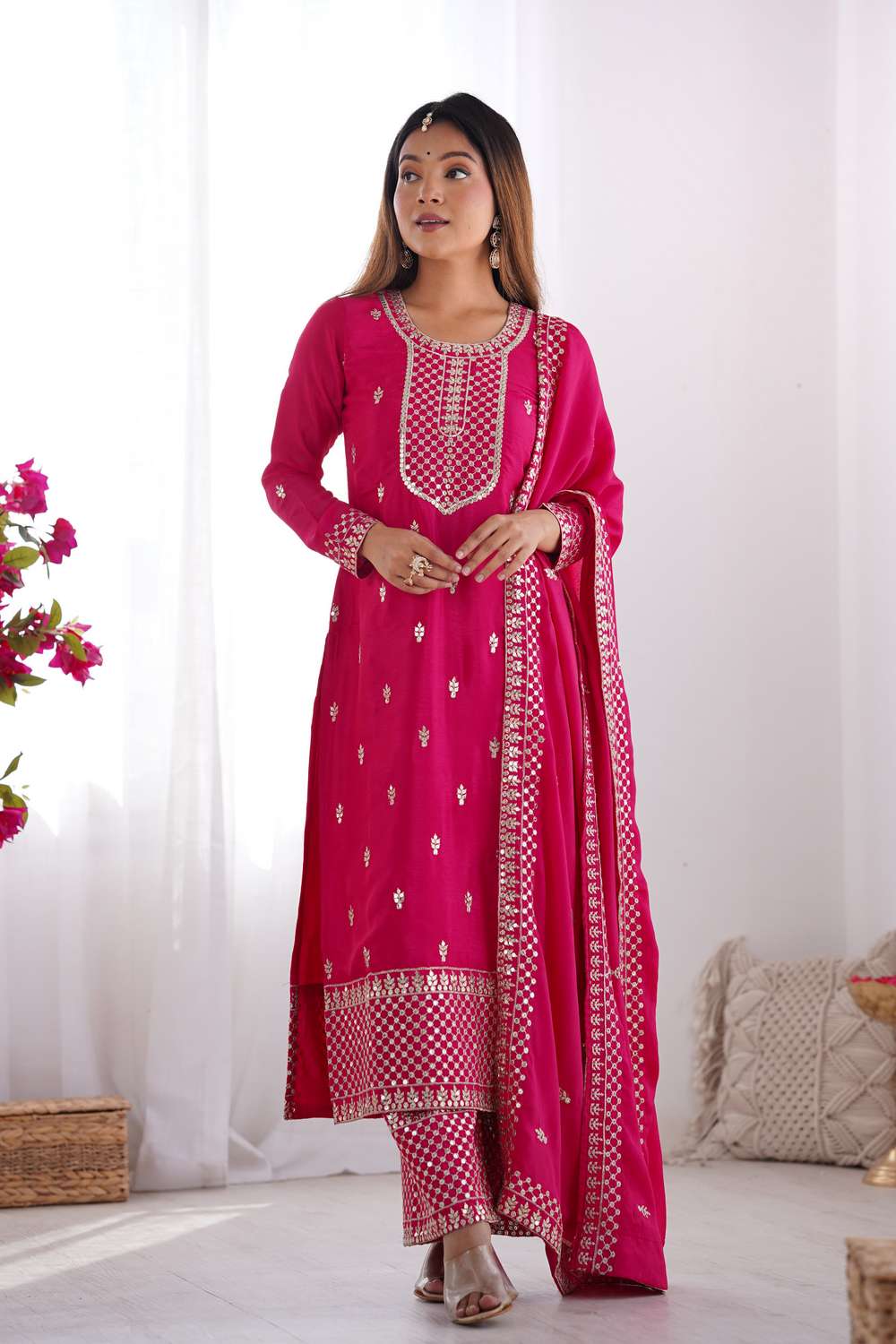 Step into effortless style with our Pakistani Suit Set crafted for the modern woman who cherishes tradition. Made from soft Chinon it keeps you comfortable all day long. The Sequin design lends a touch of sophistication to your outfit. Perfect for Festive,Sangeet this Pakistani Suit Set is a must-have for versatile styling options. Style it with minimalistic accessories and flats for a casual look or jewelry and heels for special events