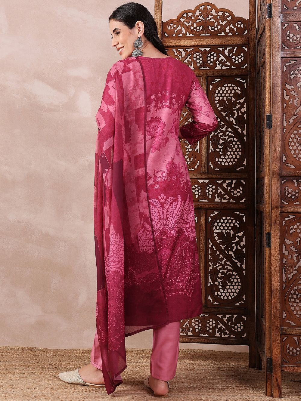 Pink Silk Blend Ethnic Motifs Printed Straight Kurti Pant With Dupatta