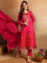 Pink Silk Ethnic Motifs Woven Design Straight Kurti Pants With Dupatta