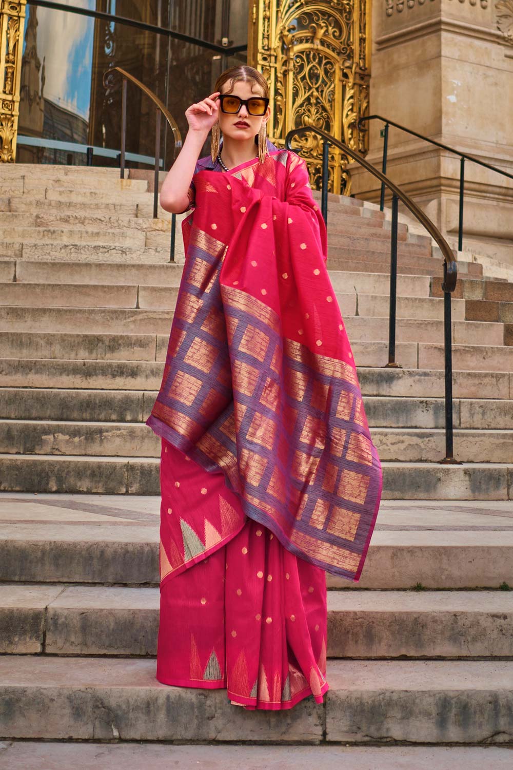 The saree is made from silk, renowned for its smooth, glossy finish and graceful drape. The color is pink.