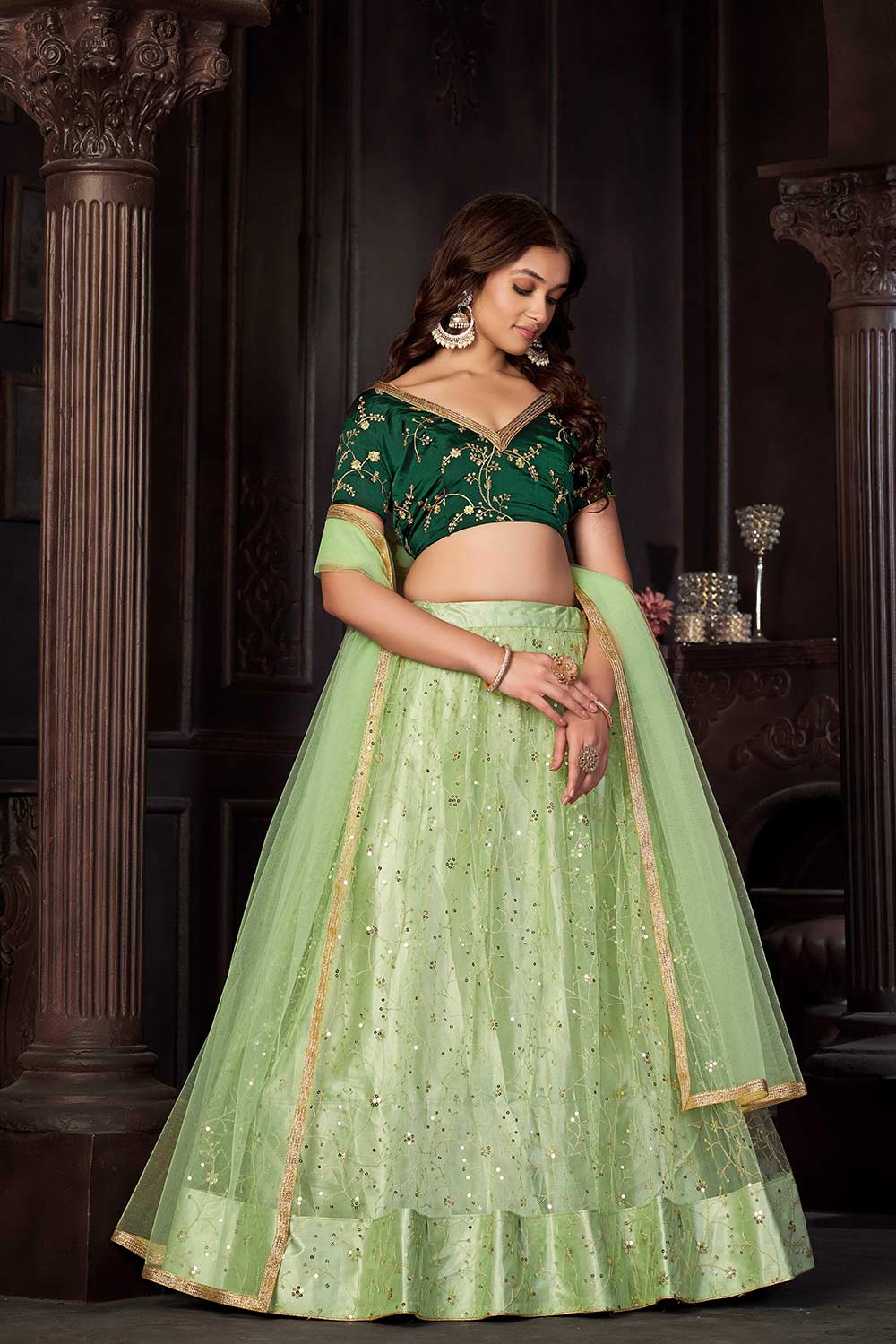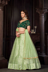 Sophisticated and stylish, this Pista Net Embroidery Round Neck Lehenga with embroidered round neck detailing is your go-to choice for memorable occasions.
