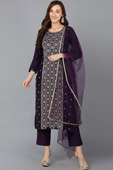 Purple Silk Blend Ethnic Motifs Straight Suit Set