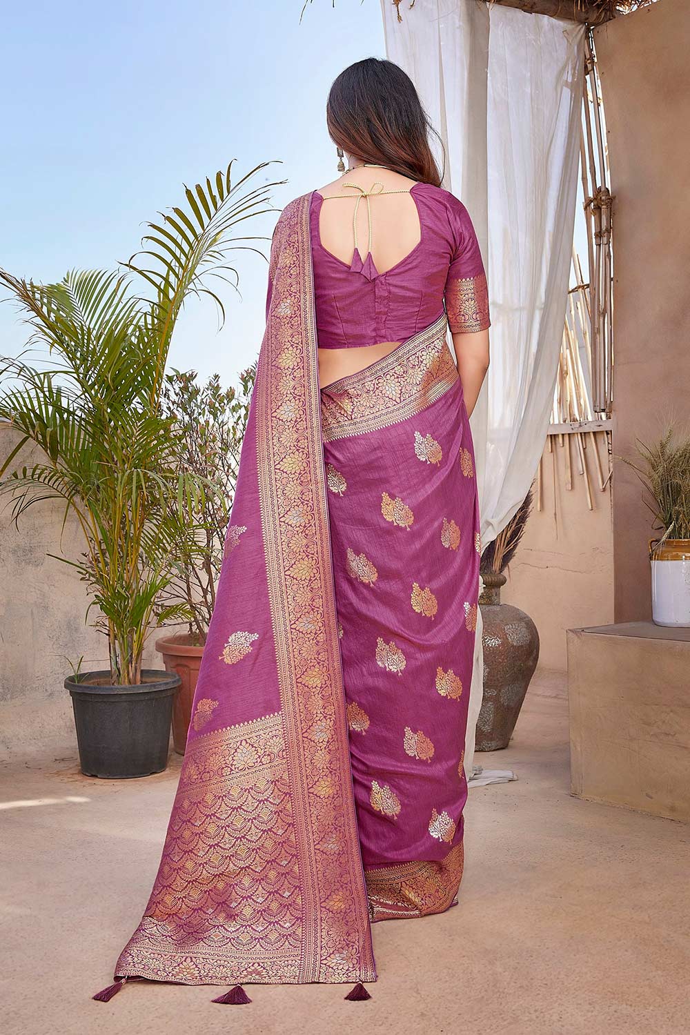 Elegant Purple Silk Blend Zari Saree saree adorned with delicate prints, perfect for any occasion. The lightweight fabric drapes beautifully, offering both comfort and style. Ideal for a sophisticated look with a touch of grace.