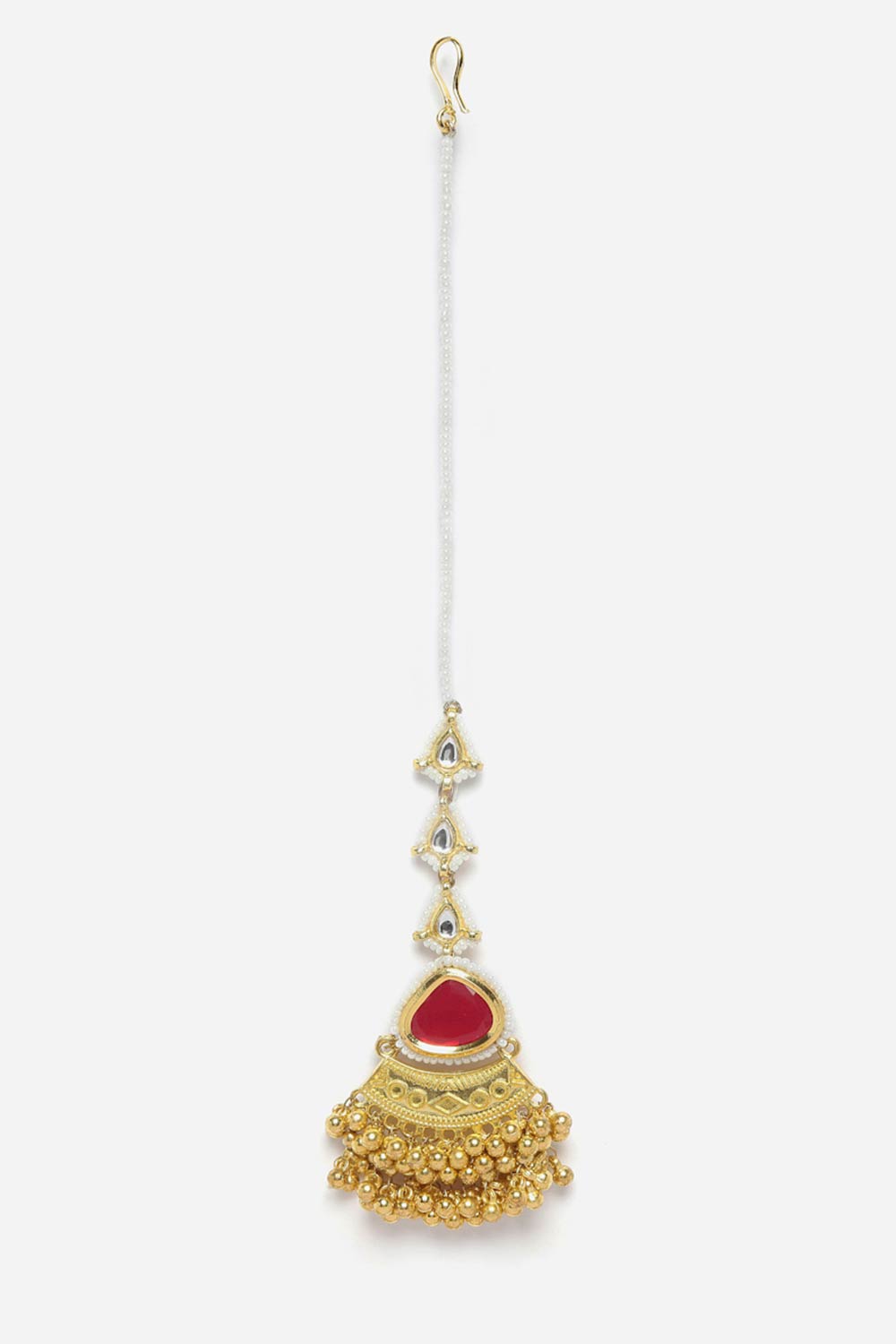 Red And Gold Adjustable Head Jewelry With Kundan And Pearls