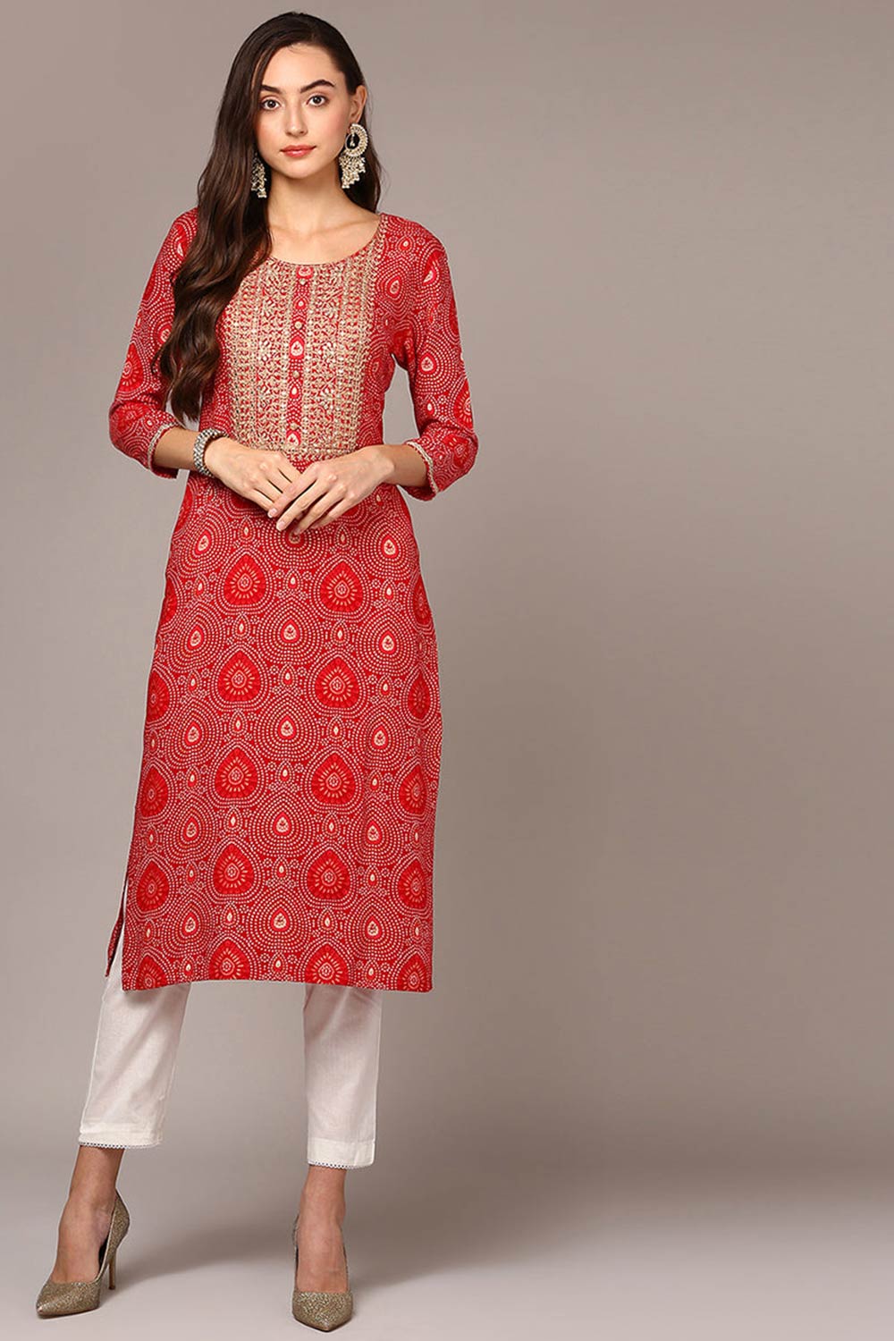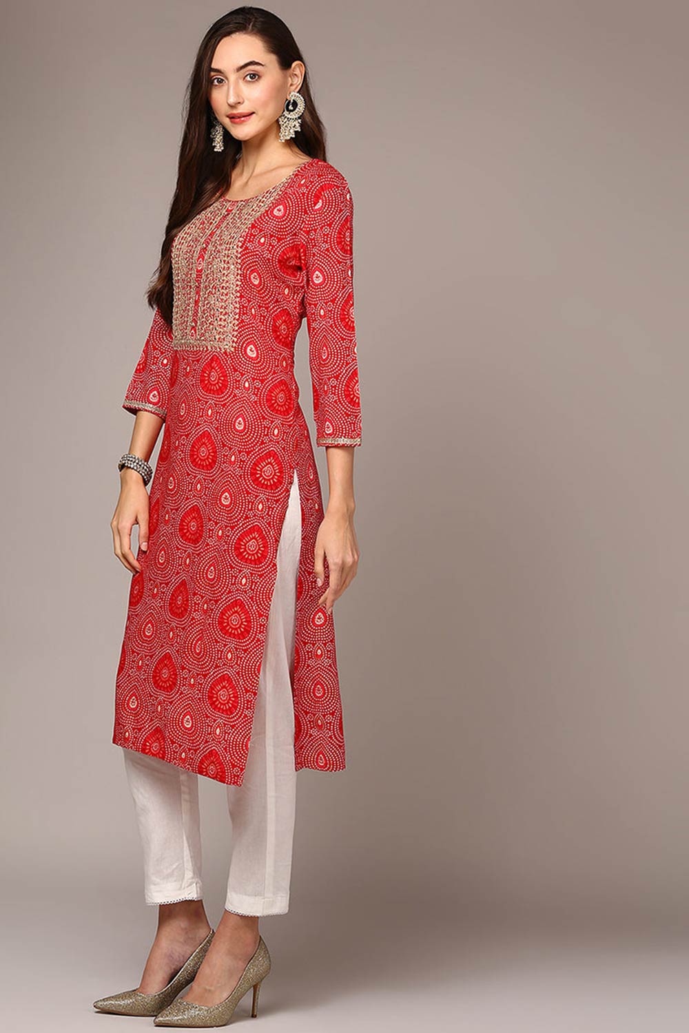 This Red Rayon Bandhani Round Neck Kurti is a timeless choice for any occasion. The intricate prints add a touch of sophistication to the ensemble, while the comfortable rayon fabric ensures effortless elegance and ease throughout the day.