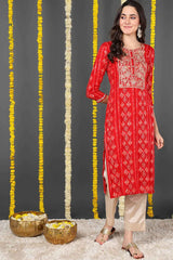 Red Rayon Floral Print Round Neck Kurti