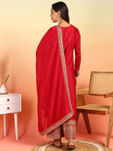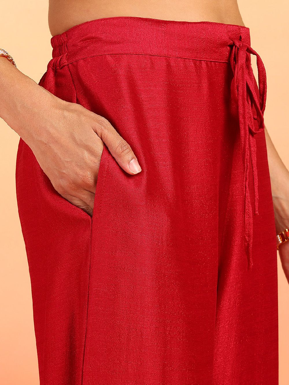 Red Silk Blend Solid Embroidered Straight Kurti Palazzo With Dupatta