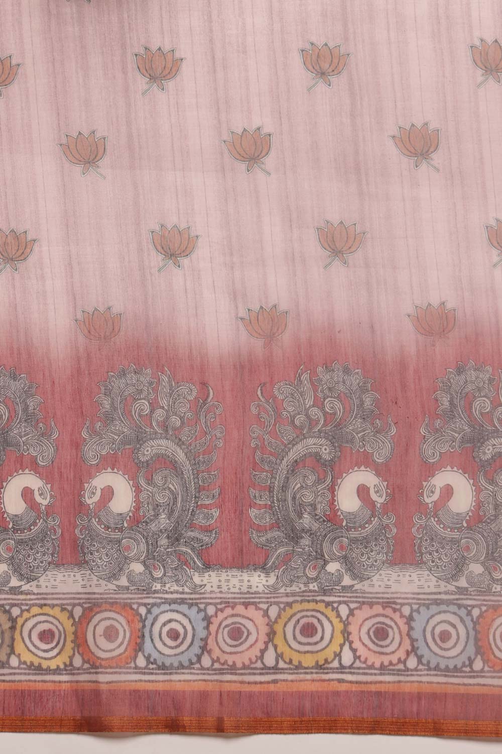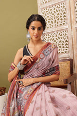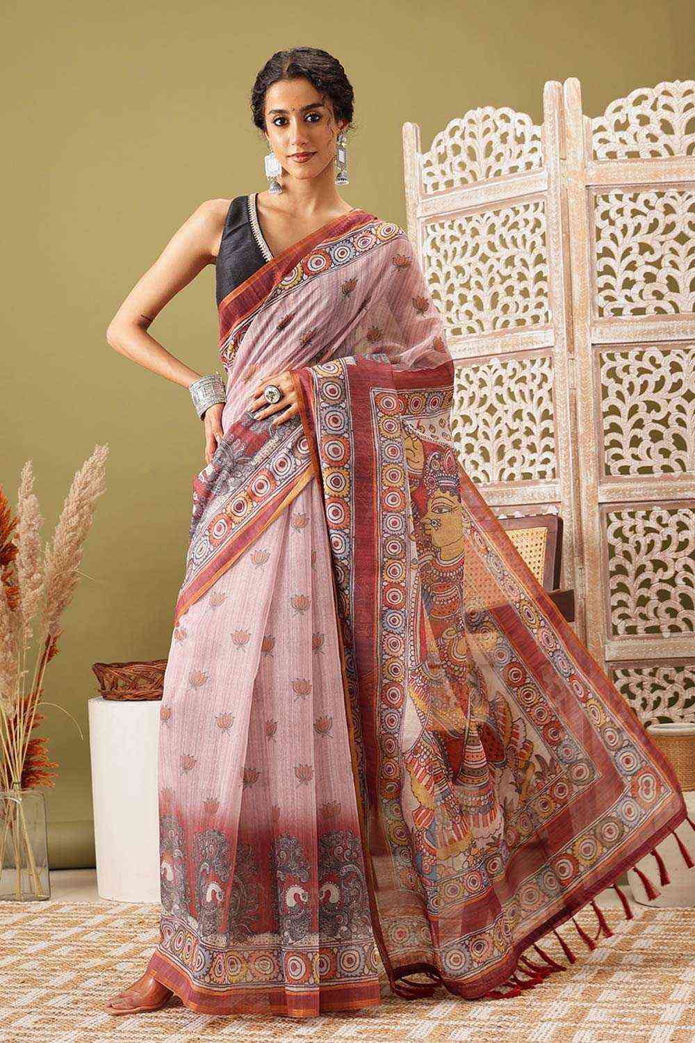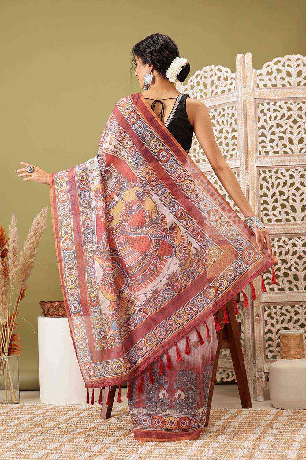 This Rust Cotton Blend Printed Madhubani Saree , with its richly detailed woven patterns, offers a blend of timeless beauty and luxurious texture, perfect for festive events.