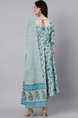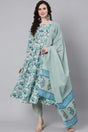 Sage Green Floral Printed Kurta With Trouser And Dupatta