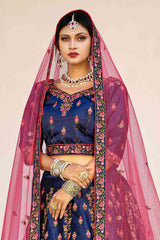 Enhance Your Personality In This Heavy Designer Lehenga Choli In Navy Blue Color Paired With Contrasting Dark Pink Colored Dupatta. Its Blouse And Lehenga Are Satin Based Paired With Net Fabricated Dupatta.