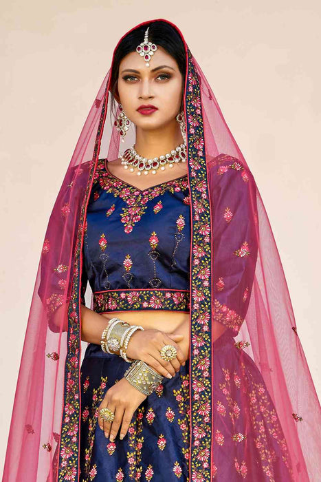Satin Embroidery Lehenga In Navy Blue