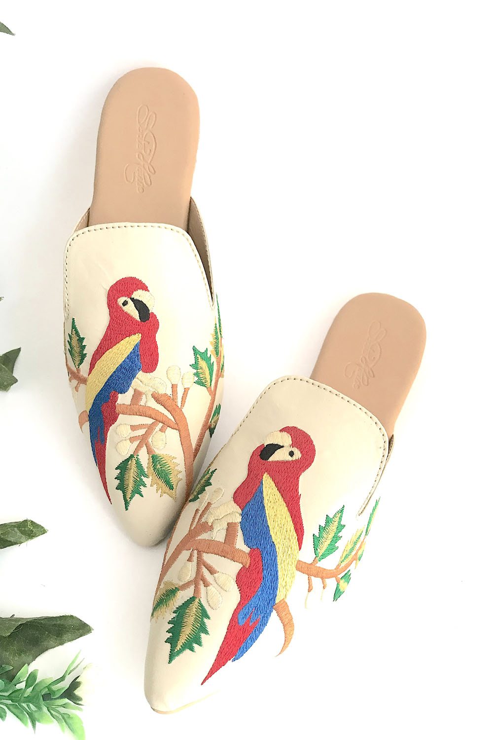 Cream Vegan leather with Bright Red parakeet Embroidery on Pointed Hi- Collar Mules