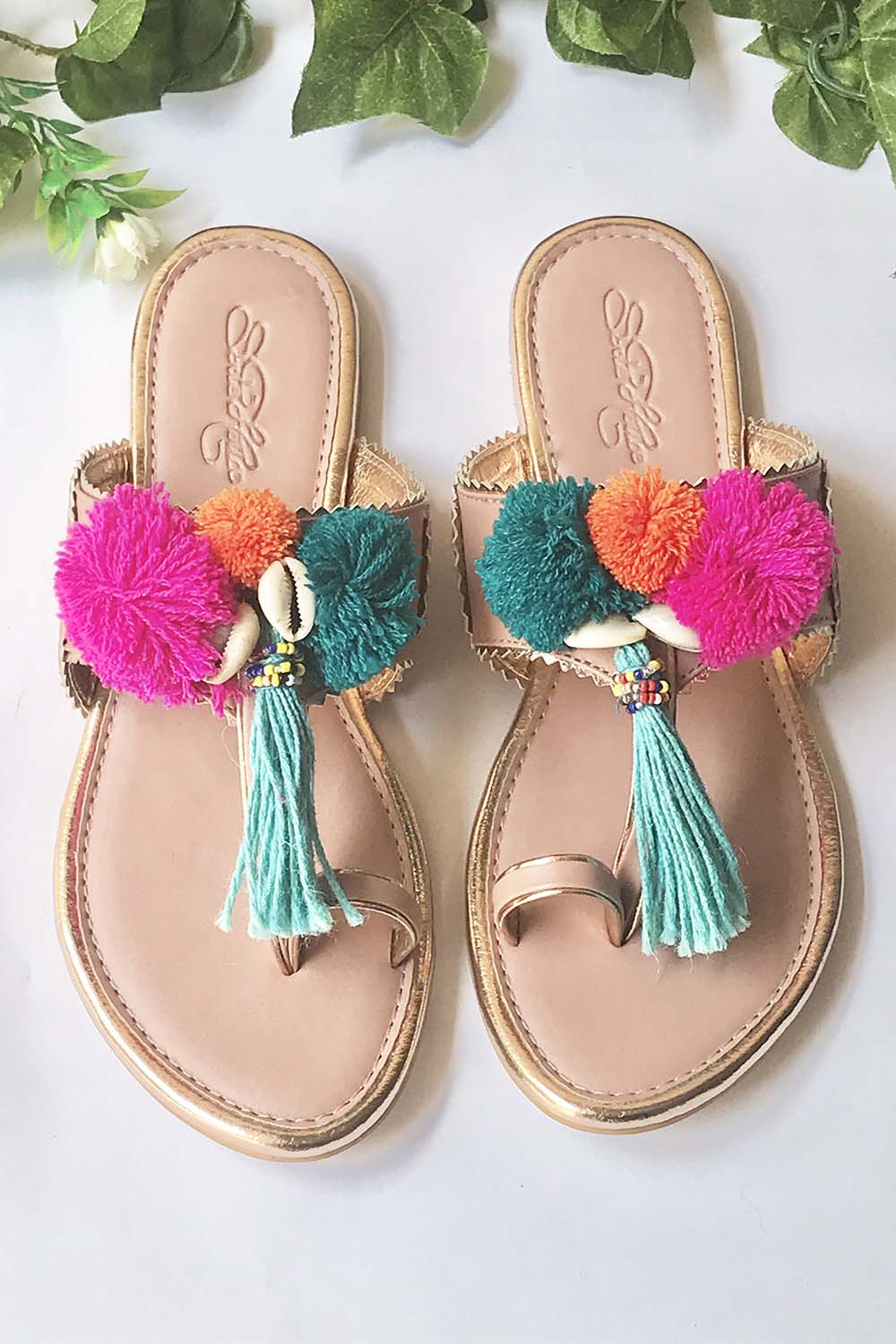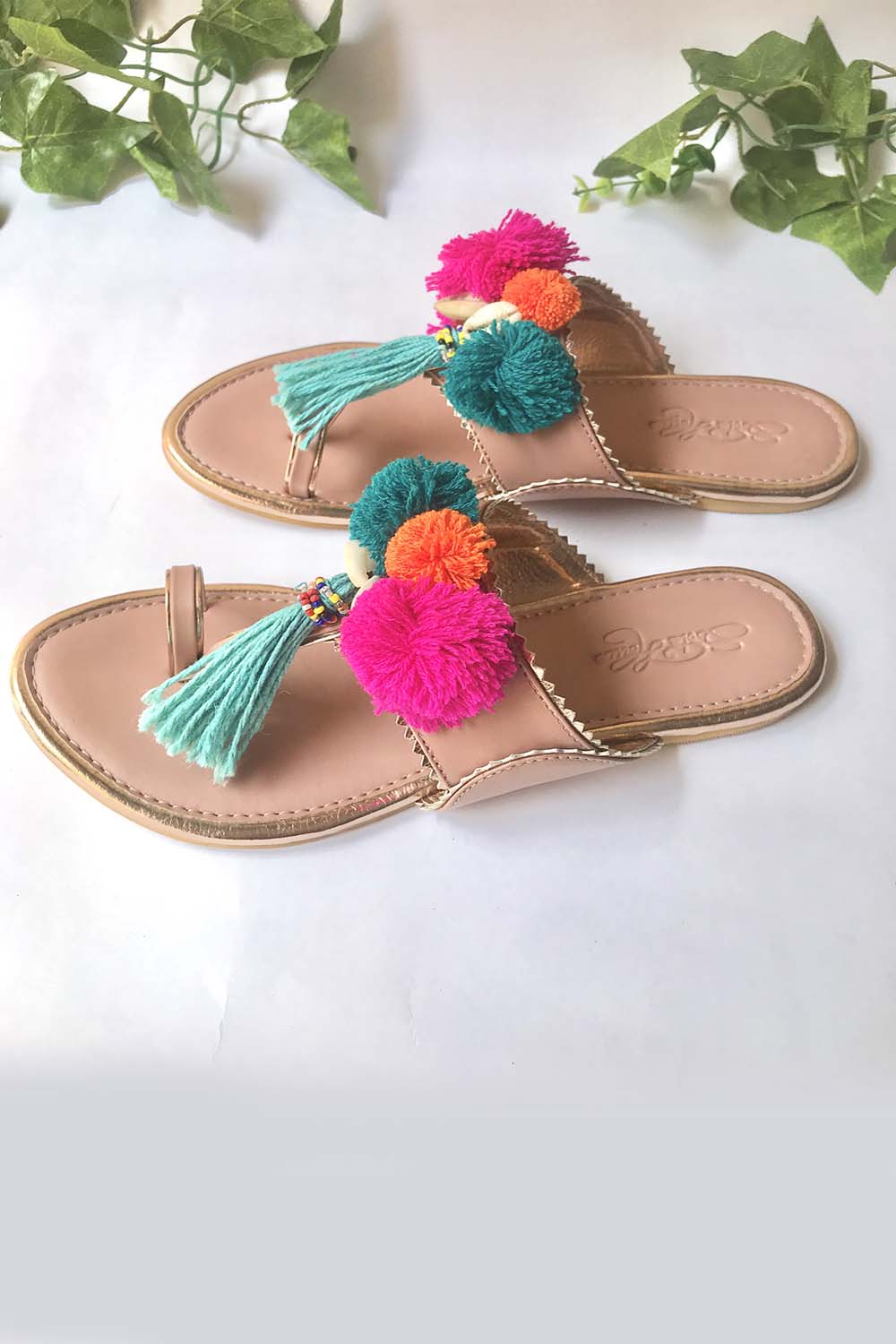 Baby pink boho tassels flats, with pom poms and filigree cutting.