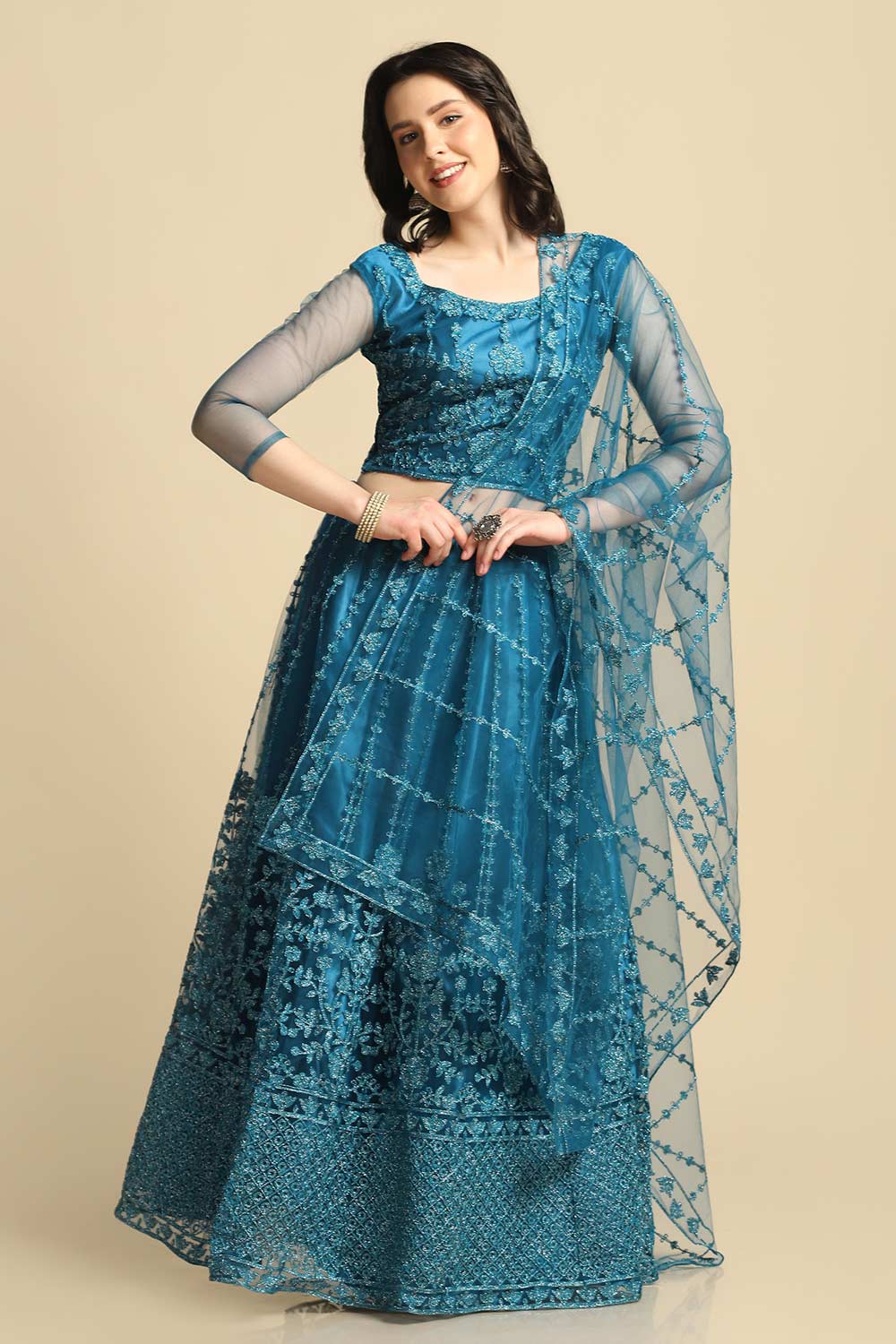 Teal Net Embroidered Work Lehenga Choli