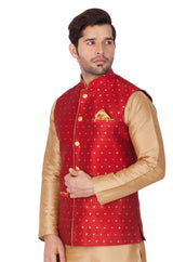 Vastramay brings to you this Stylish yet Comfortable Men Bright Maroon Men Woven Jari Jaquard Blended Cotton Modi Jacket. Adorn it for a perfect Classy and Trendy look. Pair it with a juti or a mojari for the Royal look.