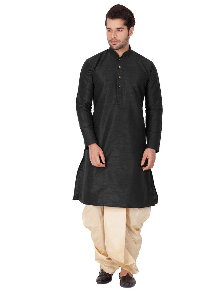 Men's Cotton Art Silk Solid Kurta And Dhoti Pant Set In Black