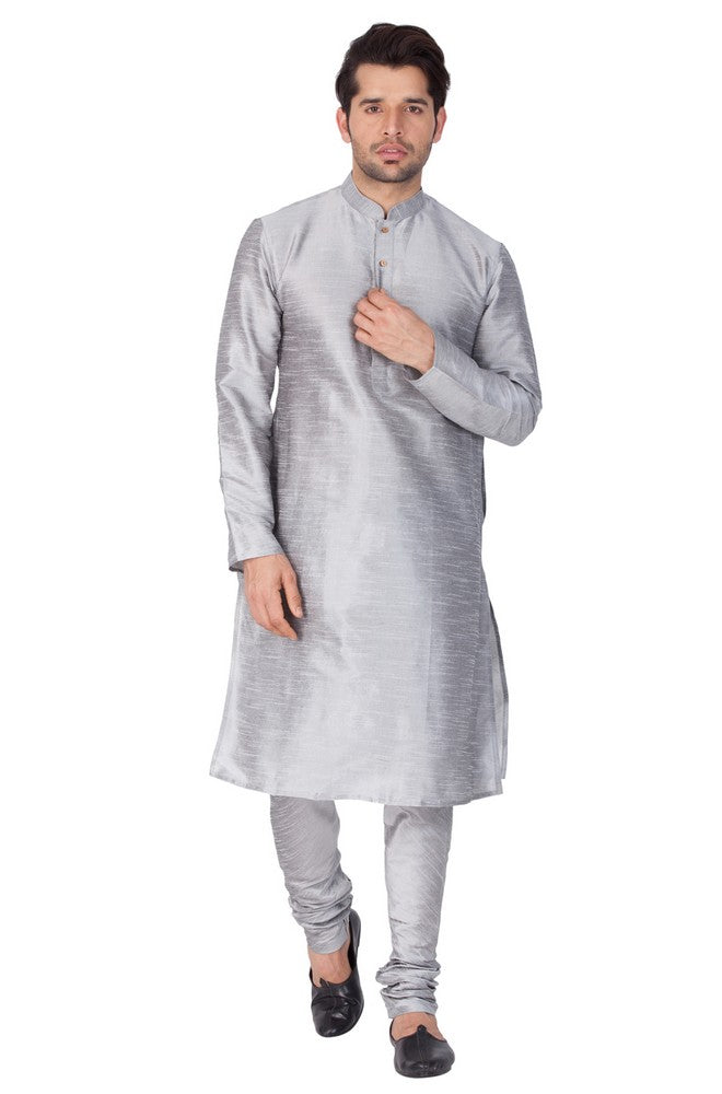 Vastramay brings to you this Stylish yet Comfortable Men Grey Men Cotton Art Silk Solid Kurta and Churidar Pyjama Set. Adorn it for a perfect Classy and Trendy look. Pair it with a juti or a mojari for the Royal look.