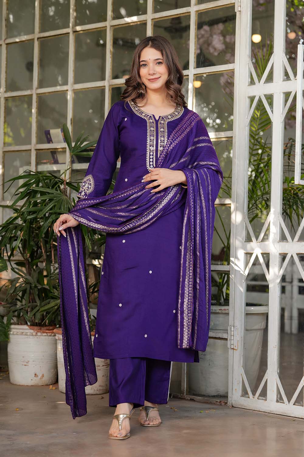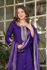 Violet Embroidered Chanderi Straight Cut Suit Set
