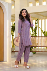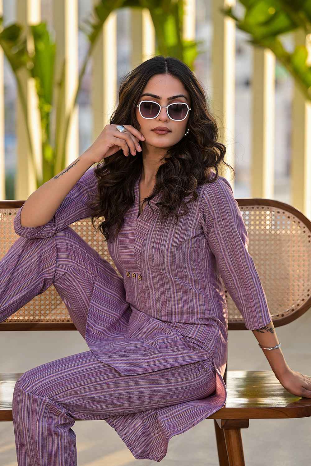 Grab attention with ease with our Violet Striped Print Cotton Co-Ord Set,the ultimate in coordinated chic. Crafted from good quality of Cotton this set is designed for comfort and style.Featuring a sleek Striped Print and ,itƒ??s perfect for creating an on-trend, put-together look.Be it a brunch outing, a casual day at work or Party,this co-ord set fits any setting. Pair it with chunky sneakers and minimal jewelry for a cool vibe, or pair it with heels and bold accessories.