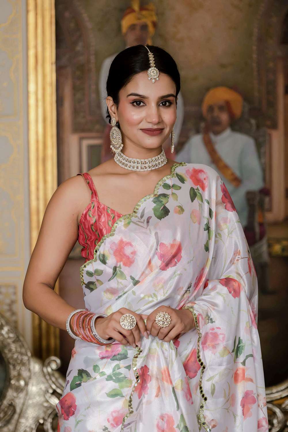 Elevate your wardrobe with our exquisite Ready to Wear Saree a masterpiece crafted to add timeless elegance to your style. Made from Chinon this saree offers a perfect mix of comfort and sophistication. Adorned with Floral Printed it showcases intricate craftsmanship that speaks volumes of tradition and artistry. Perfect for Party this saree is a versatile addition to your collection, ensuring you stand out effortlessly. Pair it with elegant Jewelry, for a glamorous look. Add Clutches or Potli Bags and complete the ensemble with Wedges & Heels , making it a perfect choice for any event. Make a statement and embrace the elegance of Saree today