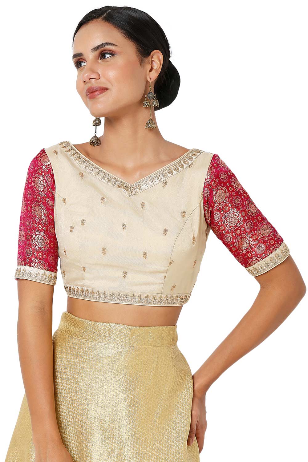 Beige & Pink Organza Embroidered Readymade Saree Blouse