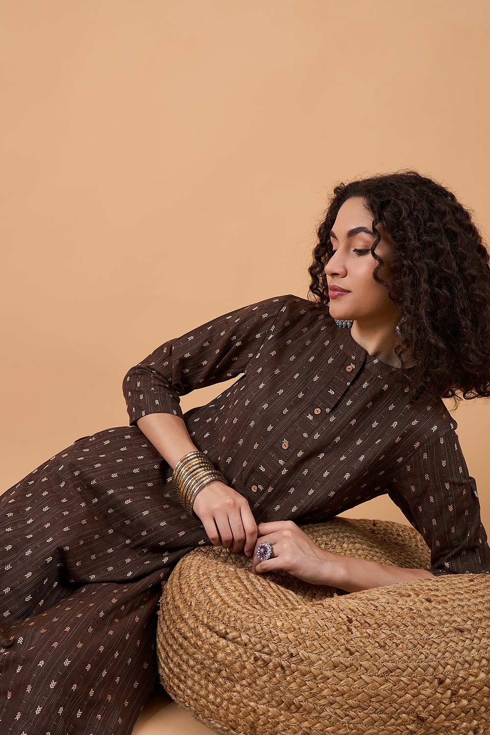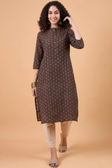 Infuse your wardrobe with understated charm and sophistication with this Brown Cotton Printed Kurti Pant Set. The rich brown hue, paired with a tasteful print, makes this set a versatile choice for both casual outings and more formal occasions.