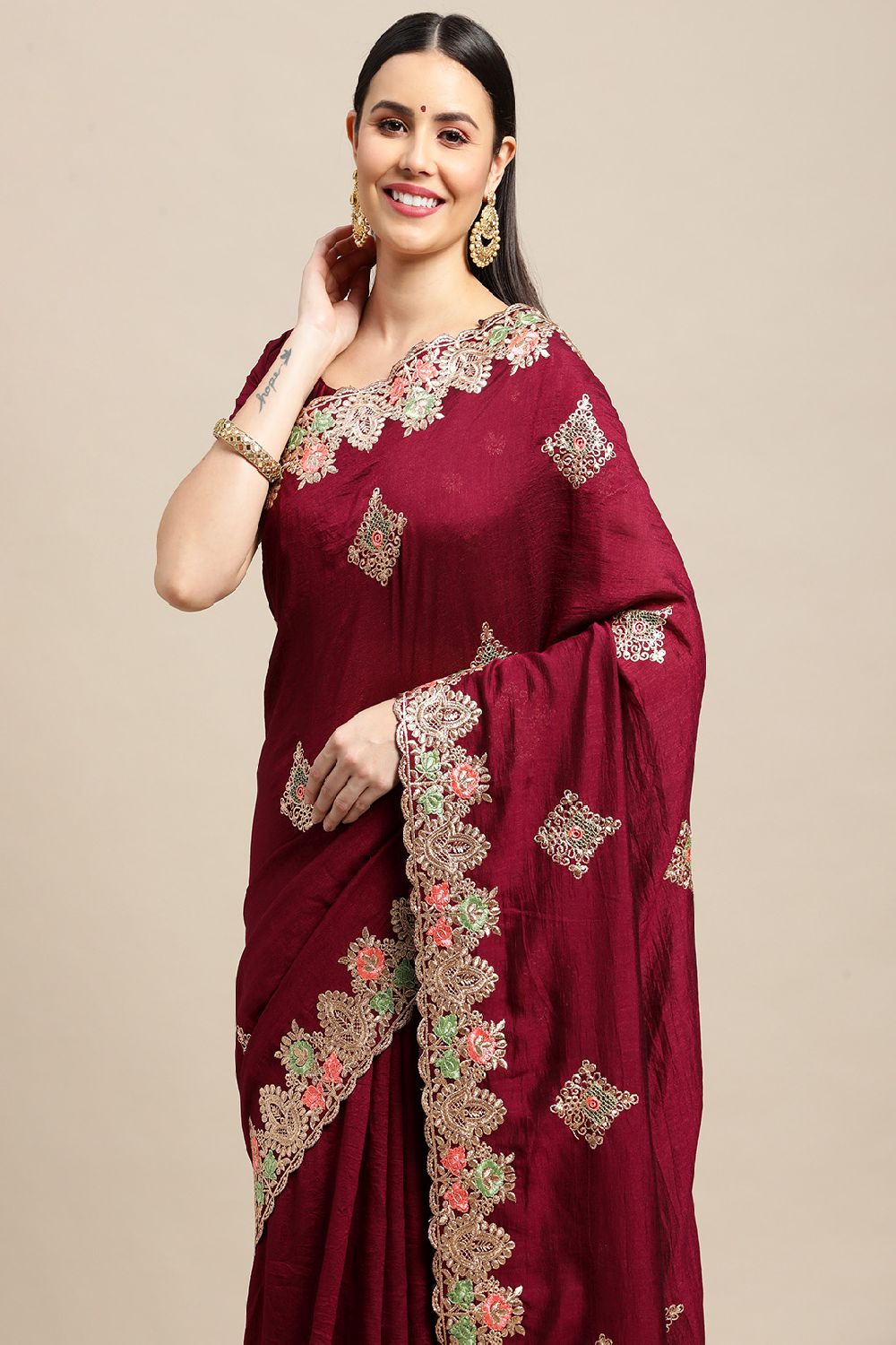 Women's Red Rangoli Silk Embroidery Lace Work Saree