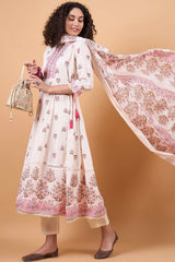 Women's White Cotton Printed Kurti Pant Set